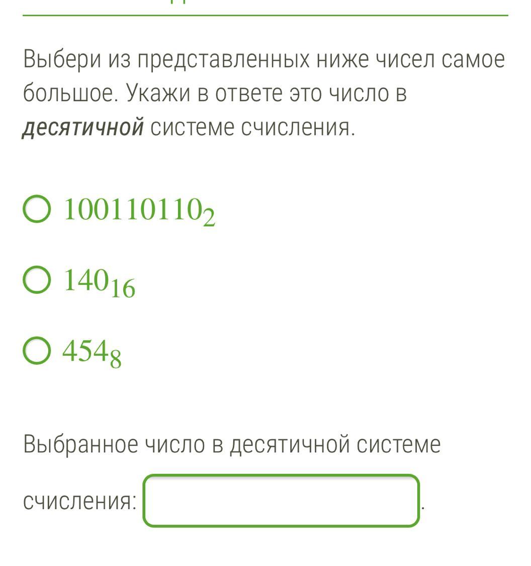 100110110₂ = 1∙2⁸+0∙2⁷+0∙2⁶+1∙2⁵+1∙2⁴+0∙2³+1∙2²+1∙2¹+0∙2⁰ = 256+0+0+32+16+0+4+2+0 = 310₁₀