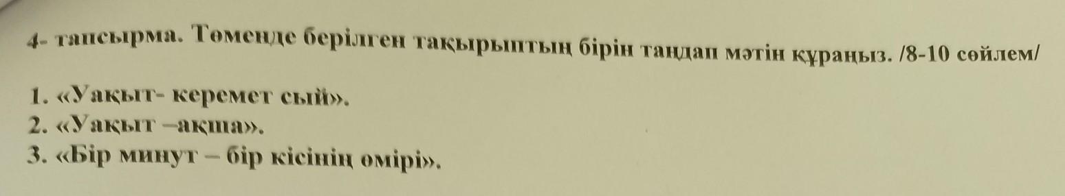 4-тапсырма. Төменде берілген тақырыптың бірін таңдап мәтін құраңыз.
