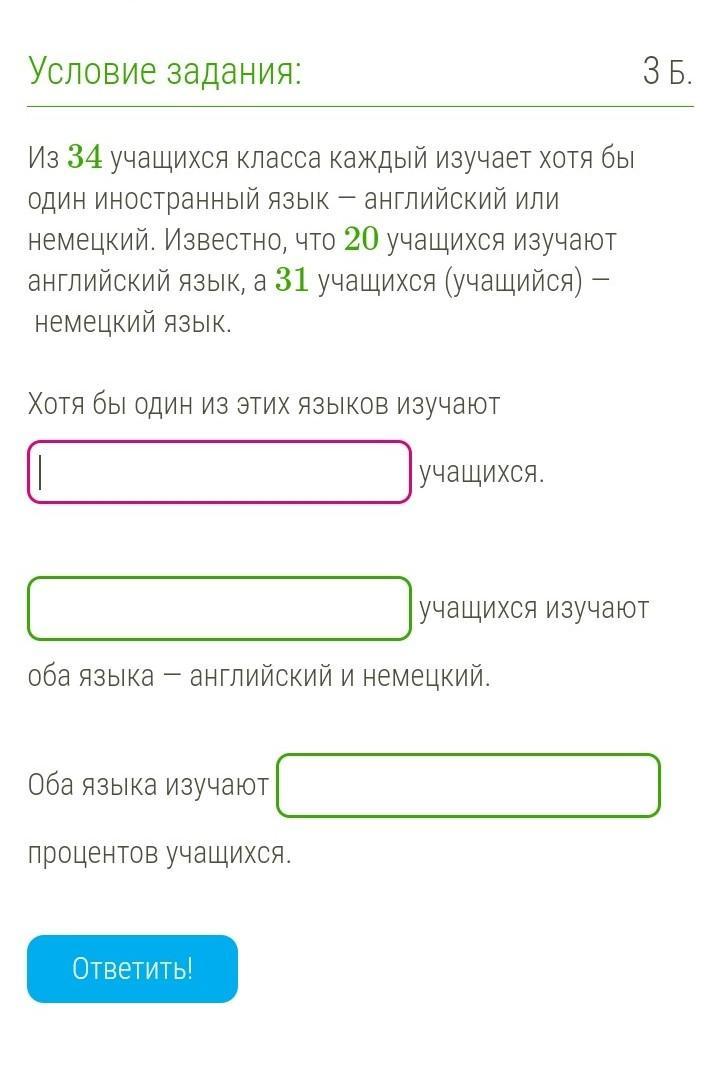 2) 19 : 38 * 100% = 50% - учащихся изучают оба языка