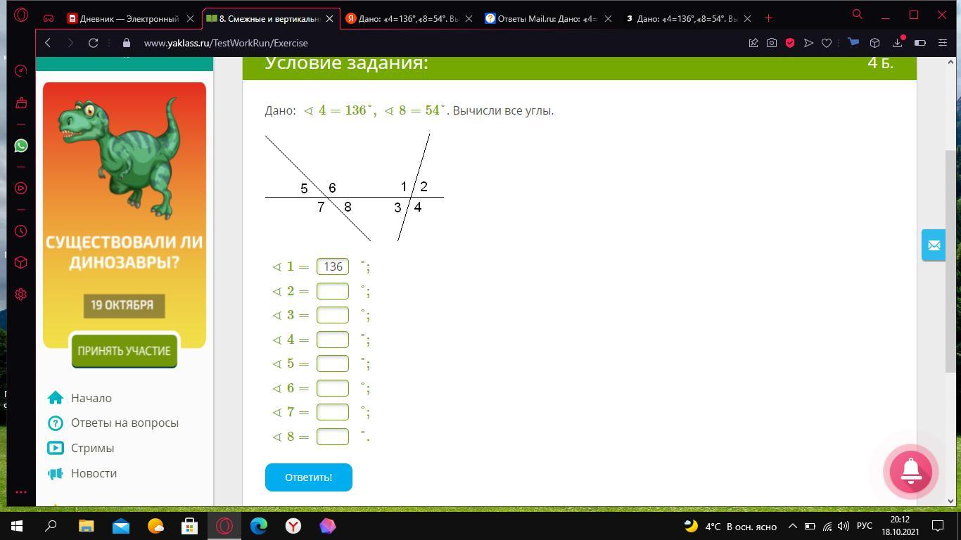 Объяснение:Угол 1 = угол, 4 = 136°, так как вертикальные углы равны.