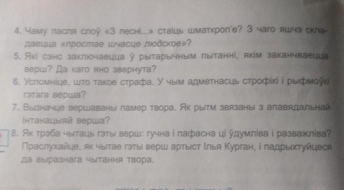 1. Вы не раз чулі, як людзі жадаюць адзін аднаму шчасця. А ці задум- валіся, што такое шчасце? Падбярыце сінонімы да гэтага слова. 2. З чаго «складаецца» чалавечае шчасце для Максіма Танка? Чаму менавіта гэтыя паняцці найперш вылучае паэт? 3. Чым вызначаецца кампазіцыя верша? Колькі аднародных членаў, якія пачынаюцца аднолькавым прыназоўнікам, ужыта ў першым сказе? З якой мэтай робіць гэта паэт?