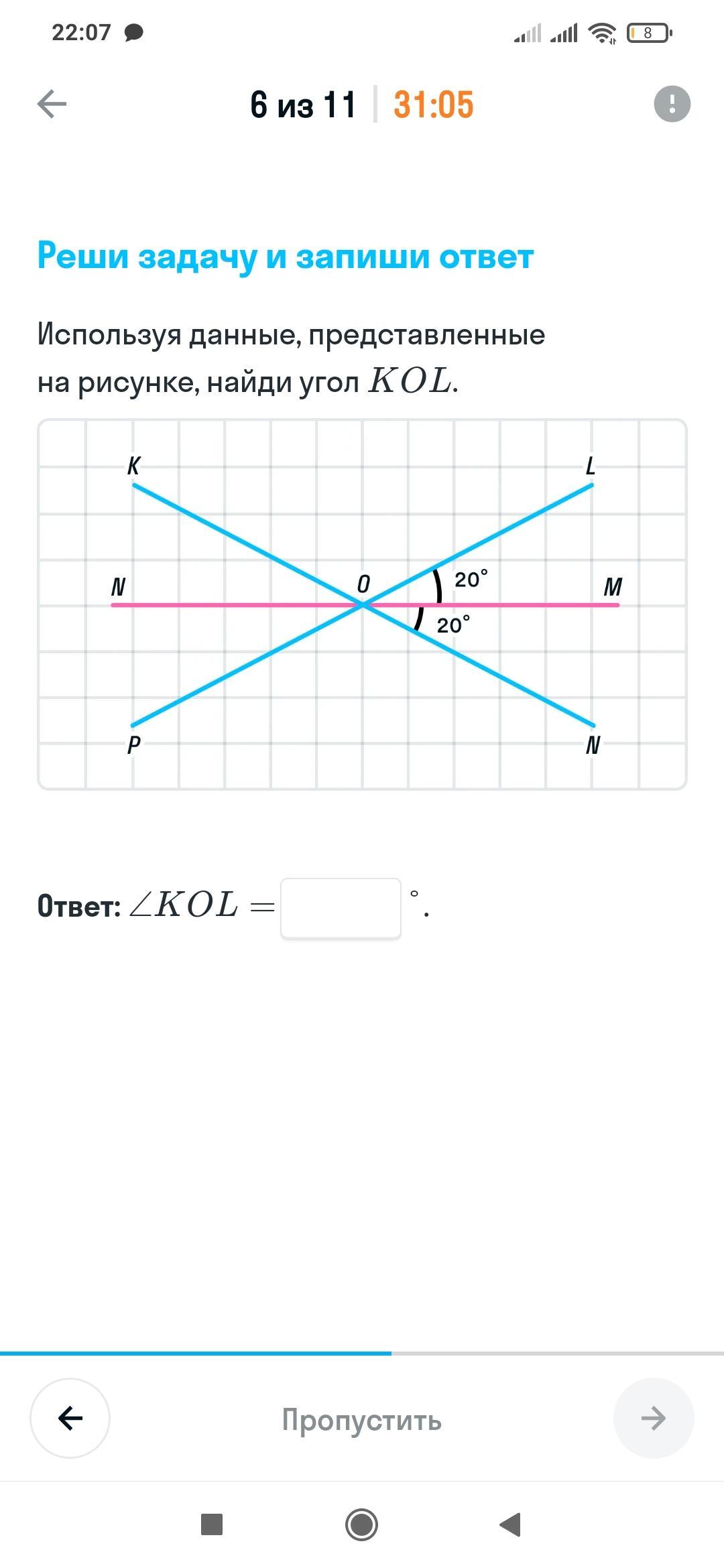 Ответ: KOL = 140 градусов.