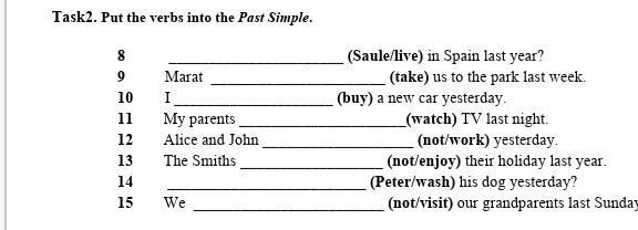 Put the verbs into the Past Simple 8. (Saule/Live) in Spain Last year (take) 10(buy) (not/work
