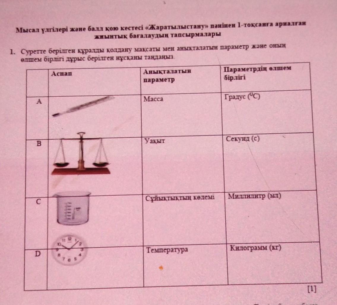 Мысал үлгілері және балл қою кестесі «Жаратылыстану» пәнінен 1 тоқсанға арналған жиынтық бағалаудың тапсырмалары 1. Суретте берілген құралды қолдану мақсаты мен анықталатын параметр және оның өлшем бірлігі дұрыс берілген нұсқаны таңданы Аспап Анықталатын Параметрдің ежем параметр Sipari А Macca Градус (с) B Уақыт Секунд (с) І. с Сұйықтықтың көлемі Миллилитр (мл) D Температура Килограмм (r) [1]