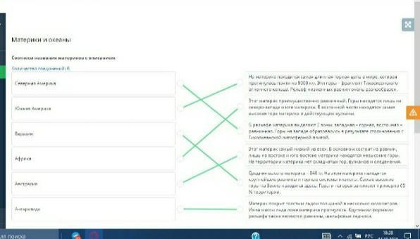 Материки и океаны Соотнеси названия материков с описанием. Количество соединений: 6 Северная Америка Южная Америка Евразия Африка Австралия Антарктида На материке находится самая длинная горная цепь в мире, которая протянулась почти на 9000 км. Эти горы – фрагмент Тихоокеанского огненного кольца. Рельеф низменных равнин очень разнообразен. Этот материк преимущественно равнинный. Горы находятся лишь на северо-западе и юге материка. В восточной части находятся самая высокая гора материка и действующие вулканы. В рельефе материка выделяют 2 зоны: западная – горная, восточная – равнинная. Горы на западе образовались в результате столкновения с Тихоокеанской литосферной плитой. Этот материк самый низкий из всех. В основном состоит из равнин, лишь на востоке и юго-востоке материка находятся невысокие горы. На территории материка нет складчатых гор, вулканов и оледенения. Средняя высота материка – 840 м. На этом материке находятся крупнейшие равнины и горные системы планеты. Самые высокие горы на Земле находятся здесь. Горы и нагорья занимают примерно 65 % территории. Материк покрыт толстым льдом толщиной в несколько километров. Из-за массы льда ложе материка прогнулось. Крупными формами рельефа также являются равнины, шельфовые ледники.