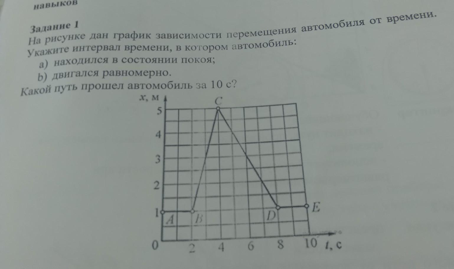 Задание 1 На рисунке дан график зависимости перемещения автомобиля от времени. Укажите интервал времени, в котором автомобиль: а) находился в состоянии покоя; b) двигался равномерно. Какой путь прошел автомобиль за 10 с? х, м. 5 3 2 1 E E D 0 6 8 10 1, с