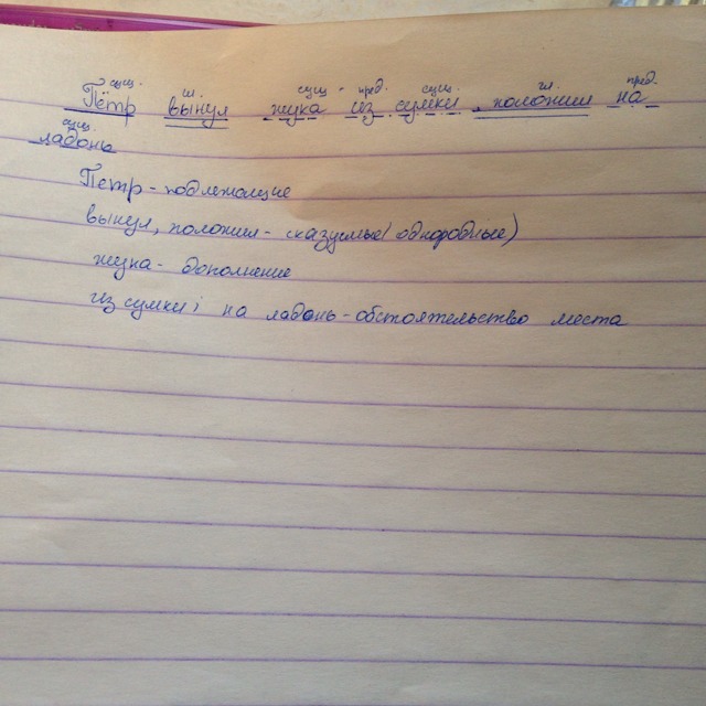 пётр (подлежащее - одной чертой) вынул (сказуемое - двумя) жука (дополнение - штрихом) из сумки (обстоятельство - штрих-точкой) положил (сказуемое - двумя) на ладонь (обстоятельство - штрих-точкой)