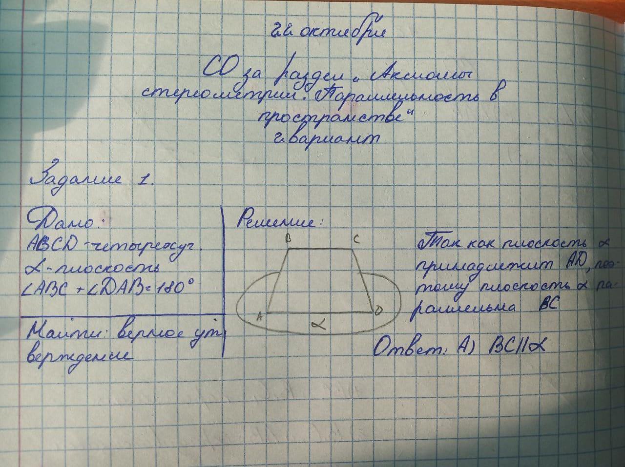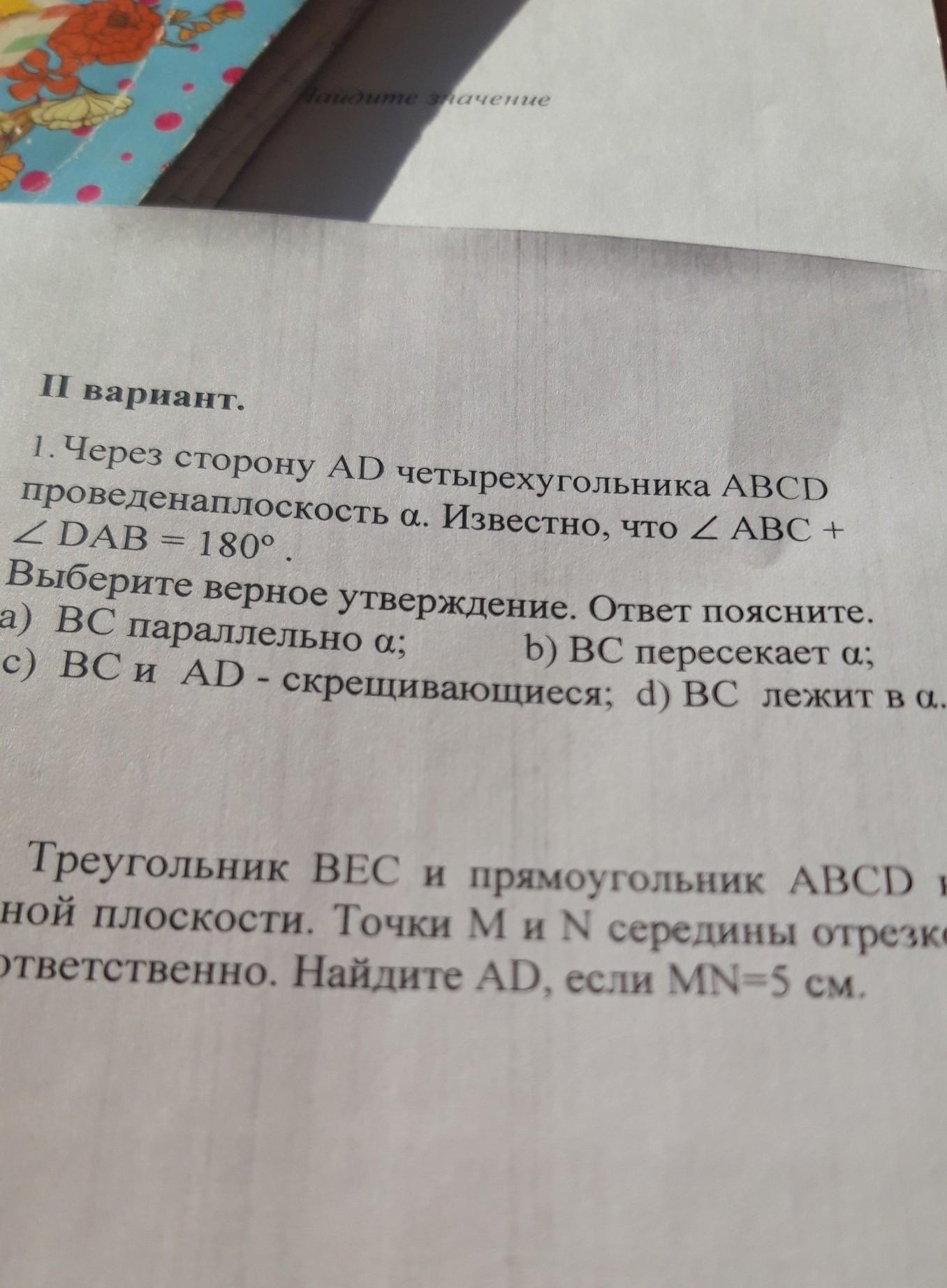 1. Через сторону AD четырехугольника ABCD проведенаплоскость а. Известно, что Z ABC + Z DAB = 180°. Z Выберите верное утверждение. Ответ поясните. а) ВС параллельно а; b) ВС пересекает а, c) BC и AD - скрещивающиеся; d) ВС лежит ва