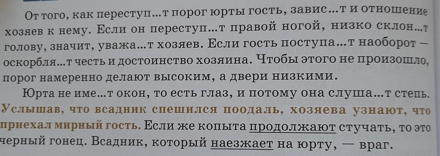 от того как переступит порог юрты гость, зависит и отношения хозяев к нему. Если он переступит правой ногой, низко склонит голову, значит, уважает хозяев. Если гость поступает наоборот- оскорбляет честь и достоинство хозяина. Чтобы этого не произошло, порог намерено делают высоким, а двери низкими.