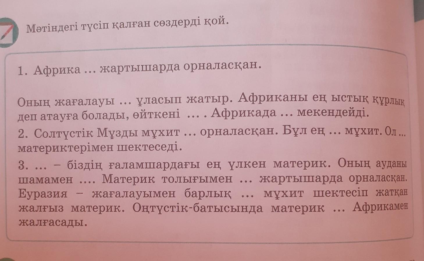 1. Африка ... жартышарда орналасқан. Оның жағалауы ... ұласып жатыр. Африканы ең ыстық құрлык деп атауға болады, өйткені . Африкада ... мекендейді. 2. Солтүстік Мұзды мұхит ... орналасқан. Бұл ең ... мұхит. Ол ... . материктерімен шектеседі. біздің ғаламшардағы ең үлкен материк. Оның ауданы Тамамен Материк толығымен жартыштарда орналасқан. Еуразия - жағалауымен барлық мүхит шектесіп жатқан жалғыз материк. Оңтүстік-батысында материк Африкамен жалғасады.