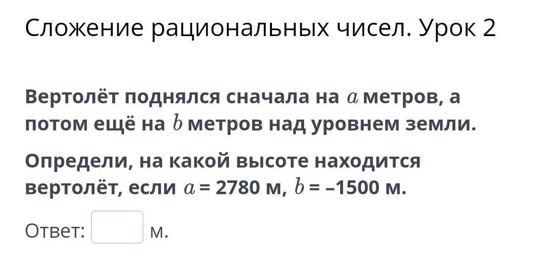 Сложение рациональных чисел. Урок 2 Вертолёт поднялся сначала на а метров, а ПОТОМ ЕЩë На 3 метров над уровнем земли. Определи, на какой высоте находится вертолёт, если а = 2780 м, b = -1500 м. Ответ: