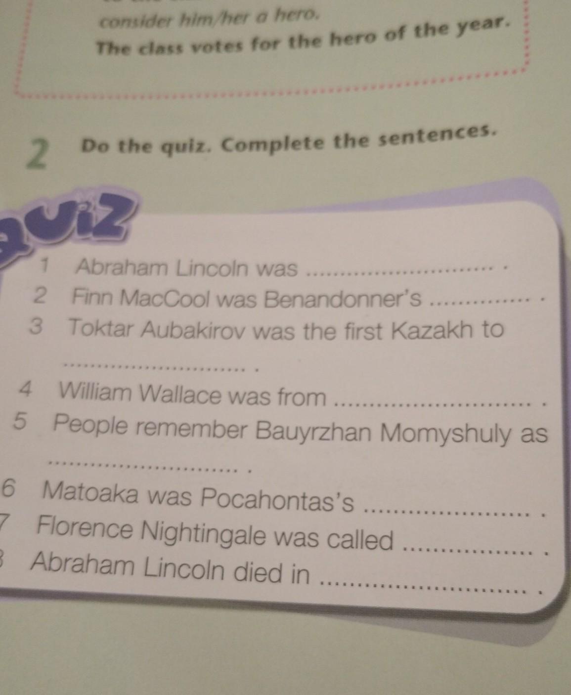 2 Do the quiz. Complete the sentences. QUE Abraham Lincoln was 2 Finn MacCool was Benandonner's 3 Toktar Aubakirov was the first Kazakh to 4 William Wallace was from 5 People remember Bauyrzhan Momyshuly as 6 Matoaka was Pocahontas's 7 Florence Nightingale was called 8 Abraham Lincoln died in *** 2
