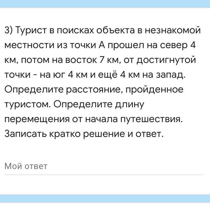 Турист в поисках объекта в незнакомой местности из точки А прошел на север 4 км, потом на восток 7 км, от достигнутой точки - на юг 4 км и ещё 4 км на запад. Определите расстояние, пройденное туристом. Определите длину перемещения от начала путешествия. Записать кратко решение и ответ.