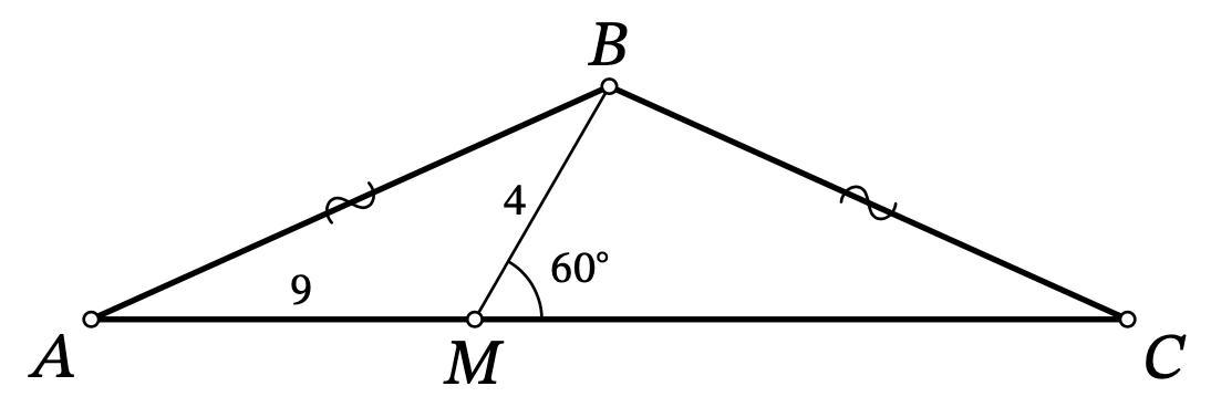 На основании AC равнобедренного треугольника ABC (AB=BC) отмечена точка M. Известно, что AM=9, MB=4, ∠BMC=60∘. Найдите длину отрезка AC.