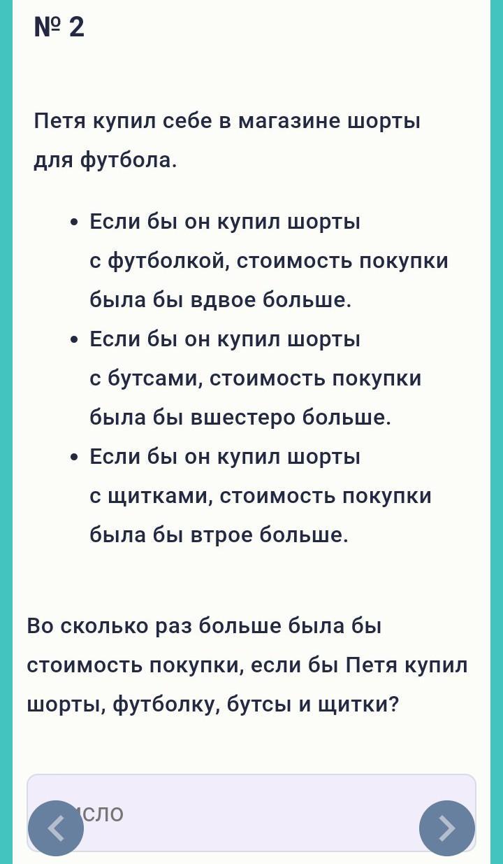 Ответ: в девятеро больше было бы, если он купил шорты, футболку, бутсы и щитки.