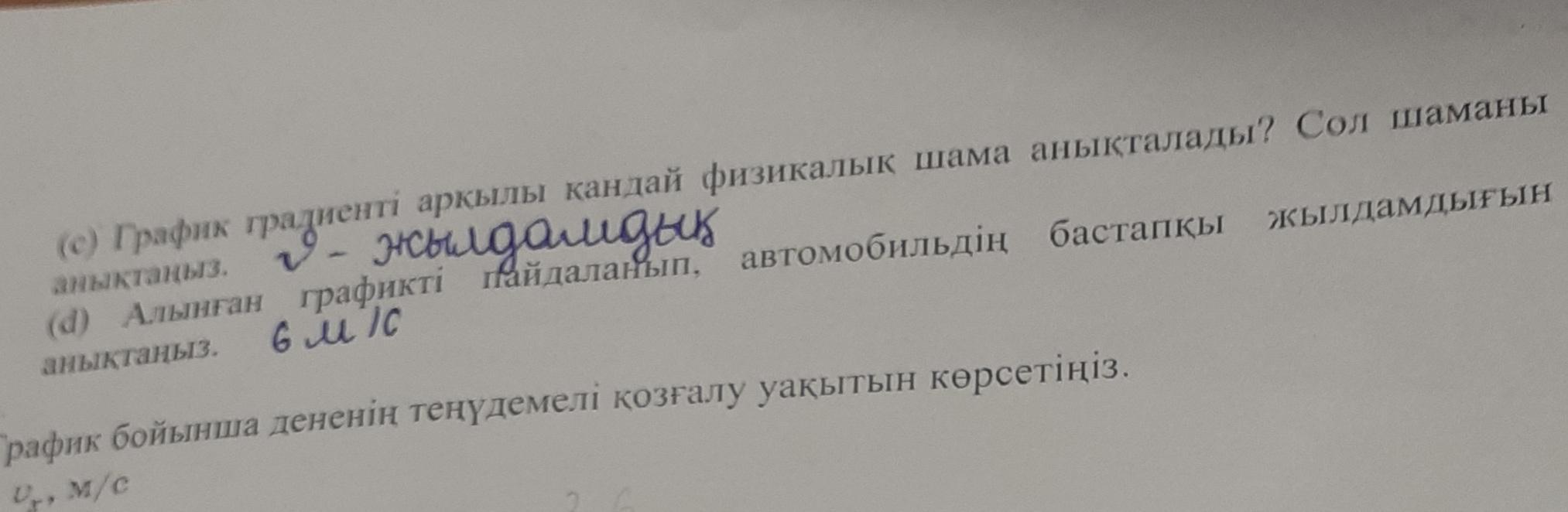 (c) График градиенті арқылы қандай физикалық шама анықталады? Сол шаманы анықтаңыз. (d) Алынған графикті пайдаланып, автомобильдің бастапқы жылдамдығын анықтаңыз. 2. График бойынша дененің теңүдемелі қозғалу уақытын көрсетіңіз. су, м/с 16 8+ 0 2 4 6 8 3. Келесі тапсырмаларды орындаңыз: (а) Берілген екі векторды сызыңыз: & = 5,5 см (209]; b = 1,8 см [160]. (b)ä және b векторларының x және у осьтеріндегі құраушыларын анықтаңыз. (c) Екі векторды қосыңыз және қорытқы вектордың мәні мен бағытын анықтаңыз.