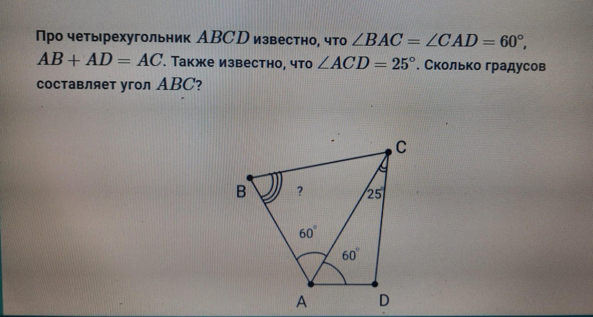 Про четырёхугольник ABCD известно, что ∠BAC = ∠CAD = 60°; AB + AD = AC. Также известно, что ∠ACD = 25°. Сколько градусов составляет угол ABC?