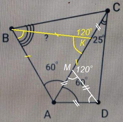 Значит, ∠CBK = ∠DCM = 25° как углы, лежащие в равных треугольниках против равных сторон.