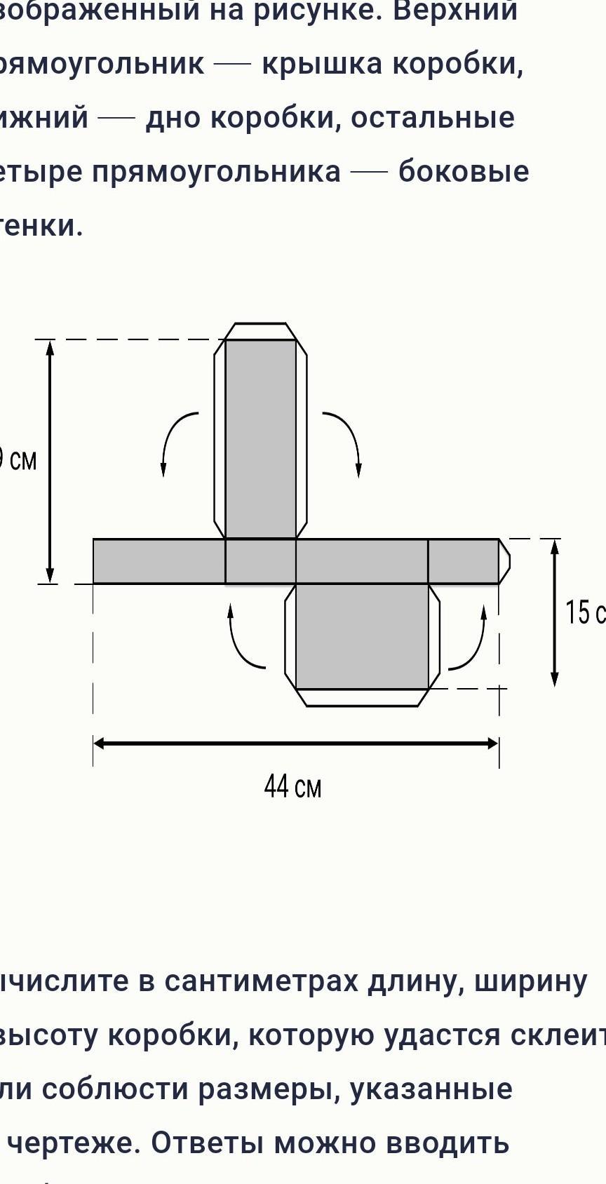 В журнале «Юный конструктор» есть чертеж для сбора небольшой коробки, изображенный на рисунке. Верхний прямоугольник — крышка коробки, нижний — дно коробки, остальные четыре прямоугольника — боковые стенки. Вычислите в сантиметрах длину, ширину и высоту коробки, которую удастся склеить, если соблюсти размеры, указанные на чертеже. Ответы можно вводить в любом порядке.
