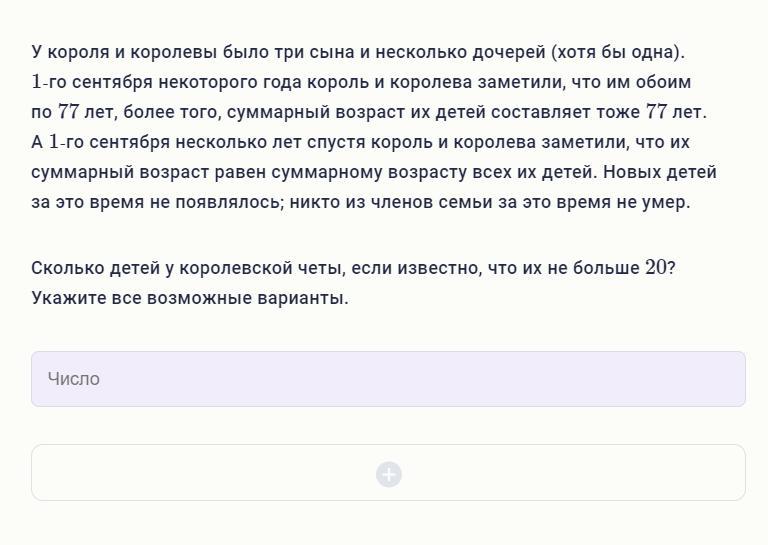 У короля и королевы было три сына и несколько дочерей (хотя бы одна). 1‑го сентября некоторого года король и королева заметили, что им обоим по 77 лет, более того, суммарный возраст их детей составляет тоже 77 лет. А 1‑го сентября несколько лет спустя король и королева заметили, что их суммарный возраст равен суммарному возрасту всех их детей. Новых детей за это время не появлялось; никто из членов семьи за это время не умер.