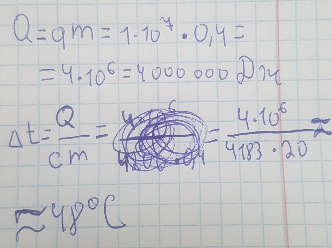На сколько градусов повысилась температура 20 кг воды, если ей была передана вся теплоты выделившаяся при полном сгорании 400 г дров, удельная теплоемкость воды 4200 дж/кг °С, удельная теплота сгорания дров 1•10⁷ дж/кг