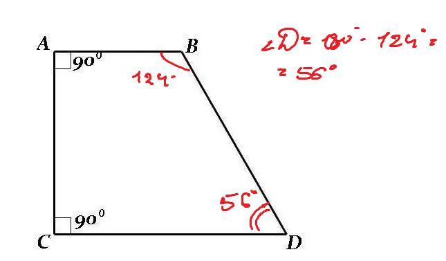 Один из углов прямоугольной трапеции равен 124 градуса. Найдите второй непрямой угол трапеции.