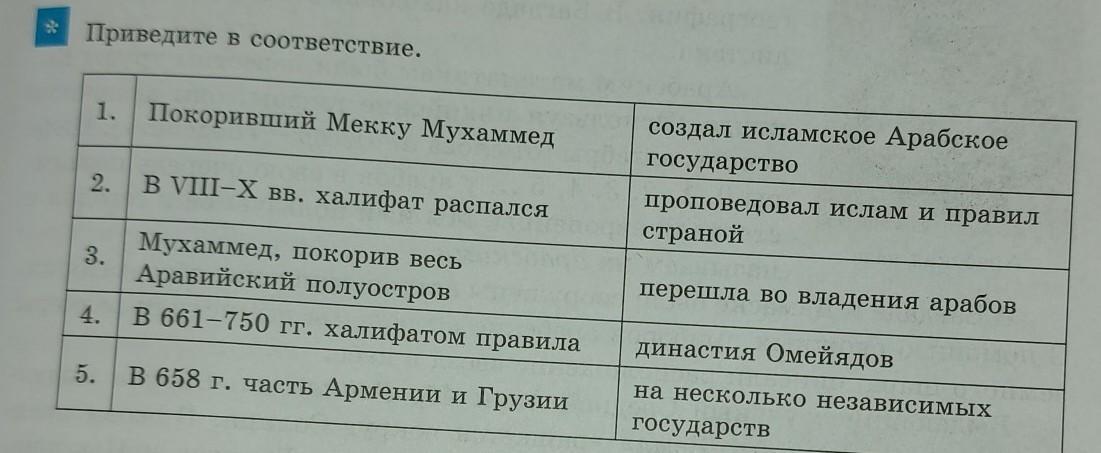 Приведите в соответствие. 1. Покоривший Мекку Мухаммед создал исламское Арабское государство проповедовал ислам и правил страной 2. в VIII-X вв. халифат распался 3. перешла во владения арабов Мухаммед, покорив весь Аравийский полуостров в 661-750 гг. халифатом правила 4. династия Омейядов 5. в 658 г. часть Армении и Грузии на несколько независимых государств