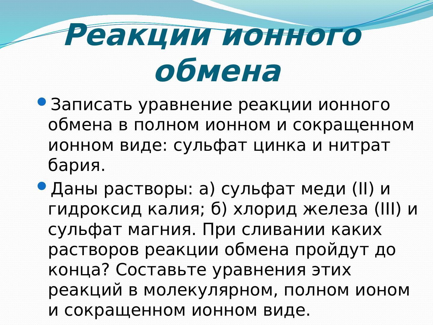 3)аРеакция идёт до конца, т. к. в результате реакции выпал осадок: ZnSO4 + Ba(NO3)2 ⟶ Zn(NO3)2 + BaSO4↓ Zn2+ + SO42- + Ba2+ + 2NO3- ⟶ Zn2+ + 2NO3- + BaSO4↓ Ba2+ + SO42- ⟶ BaSO4↓ б) Реакция идёт до конца, т. к. в результате реакции выпал осадок: CuSO4 + 2KOH ⟶ K2SO4 + Cu(OH)2↓ Cu2+ + SO42- + 2K+ + 2OH- ⟶ 2K+ + SO42- + Cu(OH)2↓ Cu2+ + 2OH- ⟶ Cu(OH)2↓ в) Реакция идёт до конца, т. к. в результате реакции выпал осадок: 3ZnSO4 + 2Na3PO4 ⟶ 3Na2SO4 + Zn3(PO4)2↓ 3Zn2+ + 3SO42- + 6Na+ + 2PO43- ⟶ 6Na+ + 3SO42- + Zn3(PO4)2↓ 3Zn2+ + 3SO42- + 6Na+ + 2PO43- ⟶ 6Na+ + 3SO42- + Zn3(PO4)2↓ Реакция идёт до конца, т. к. в результате реакции выпал осадок: 3MgCl2 + 2Na3PO4 ⟶ 6NaCl + Mg3(PO4)2↓ 3Mg2+ + 6Cl- + 6Na+ + 2PO43- ⟶ 6Na+ + 6Cl- + Mg3(PO4)2↓ 3Mg2+ + 2PO43- ⟶ Mg3(PO4)2↓ г) Реакция является обратимой, т. к. в результате реакции не образуется осадок, газ или малодиссоциирующего вещества: 2FeCl3 + 3MgSO4 ⇄ 3MgCl2 + Fe2(SO4)3 2Fe3+ + 6Cl- + 3Mg2+ + 3SO42- ⇄ 3Mg2+ + 6Cl- + 2Fe3+ + 3SO42-
