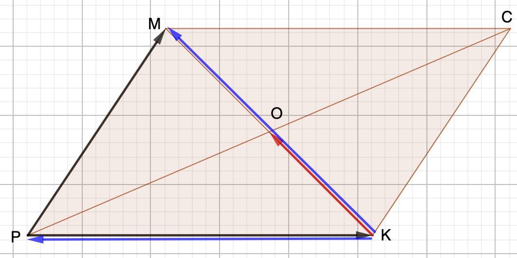 Диагонали параллелограмма РМСК пересекаются в точке О. Выразите вектор КО через векторы РК и РМ
