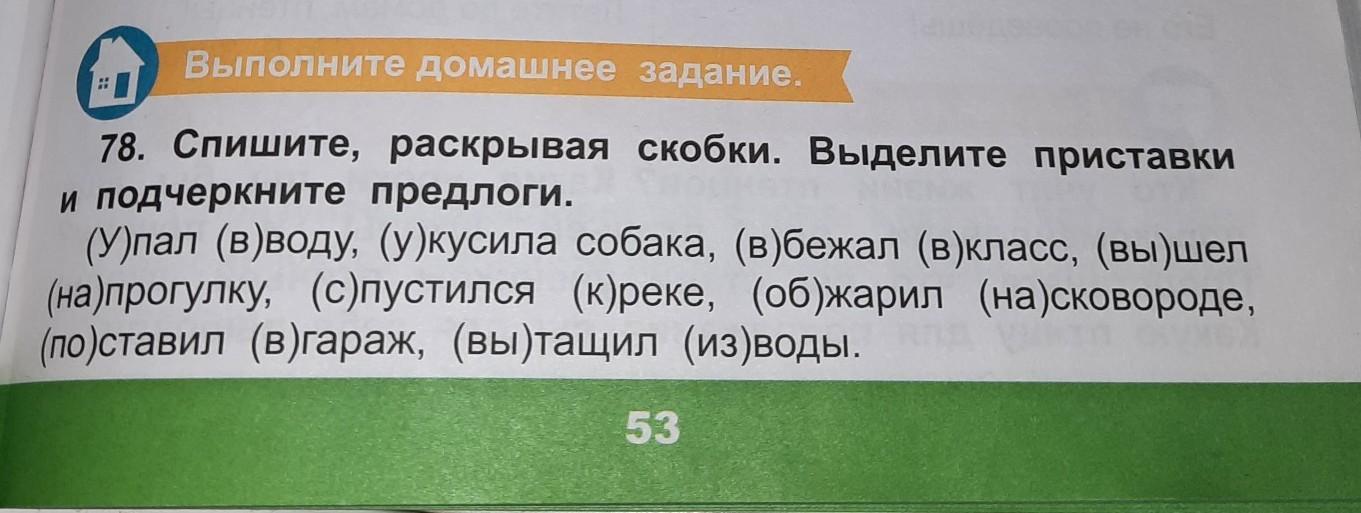 Упал в воду, укусила собака, вбежал в клас, вышел на прогулку, спустился к реке, обжарил на сковороде, поставил в гараж, вытащил из воды.