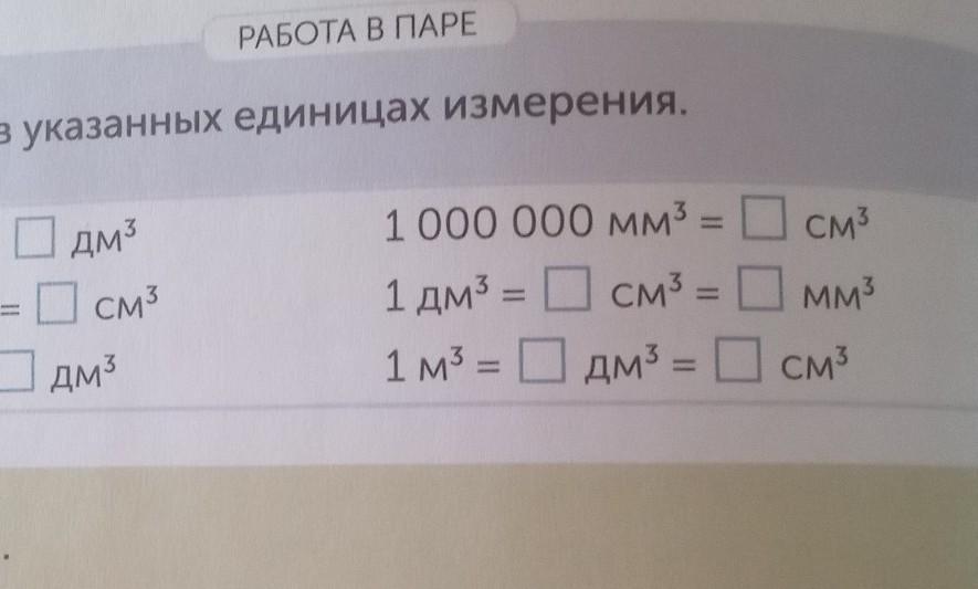 РАБОТА В ПАРЕ 3 Вырази в указанных единицах измерения. 12 м3 = 0 дм3 12 дм = 0 см3 CM3 3 м3 = Одм 1 000 000 мм - 0 см . 1 1 дм = 0 см = 0 мм 1 м3 = Одм = 0 см