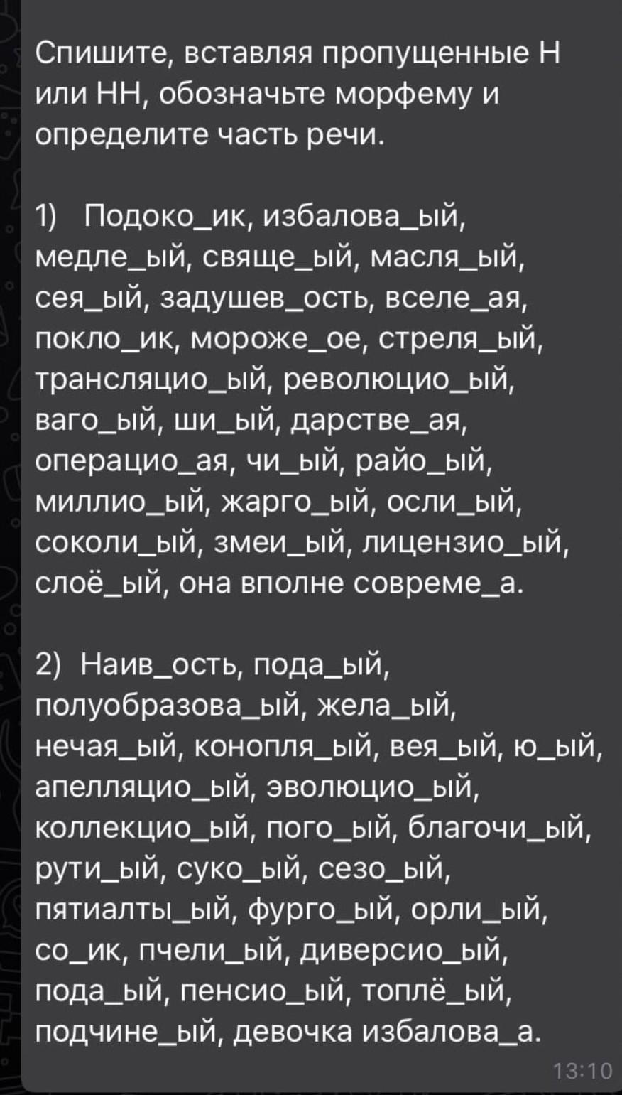 Ответ: 1) Подоконник, избалованный, медленный, священный, масляный, сеянный, задушевность, вселенная, поклонник, мороженое, стреляный, трансляционный, революционный, вагонный, шинный, дарственная, операционная, чинный, районный, миллионный, жаргонный, ослиный, соколиный, змеиный, лицензионный, слоённый, она вполне современна.