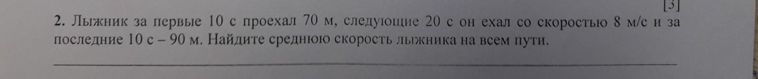 [5] 2. Лыжник за первые 10 с проехал 70 м, следующие 20 с он ехал со скоростью 8 м/с и за последние 10 с - 90 м. Найдите среднюю скорость лыжника на всем пути. го