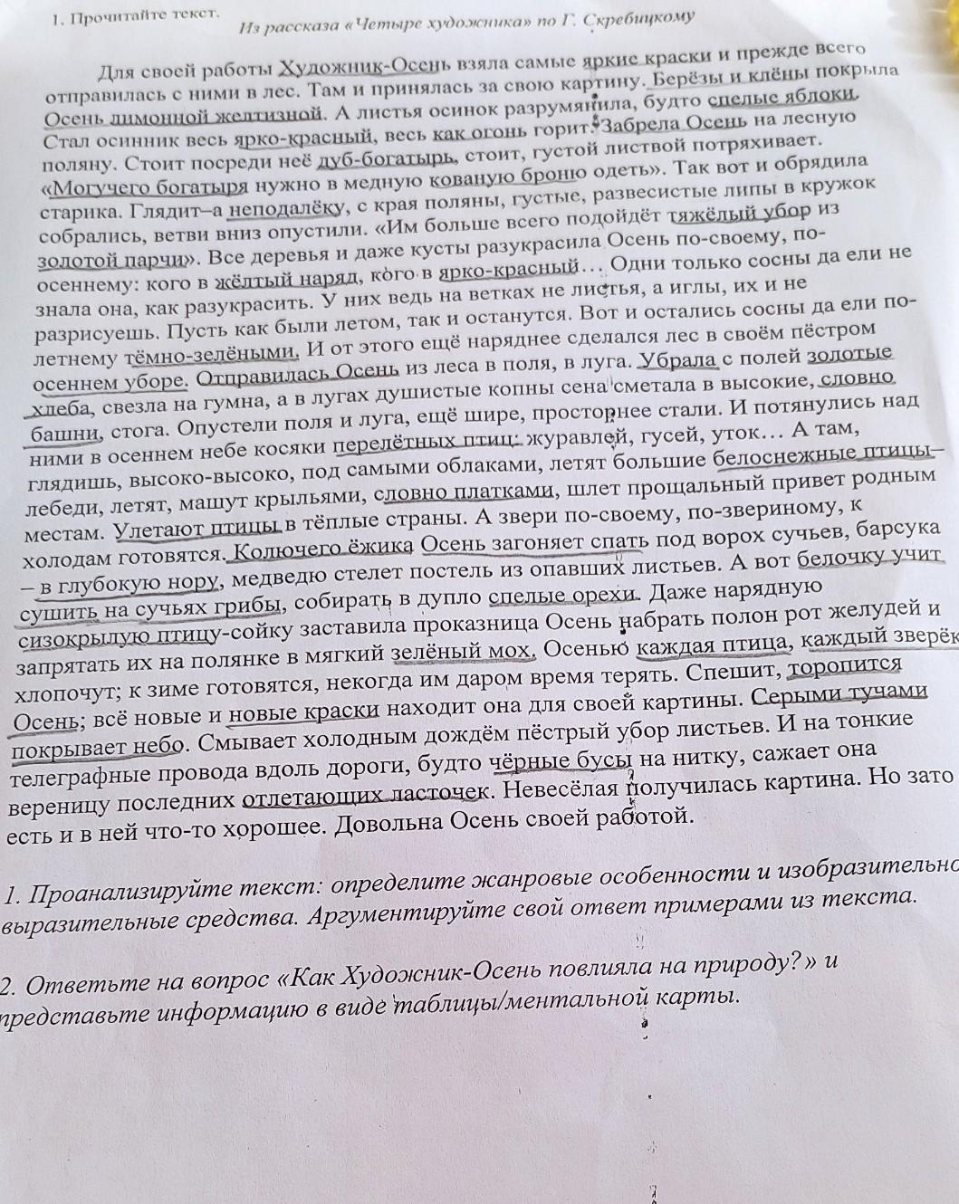 1. Проанализируйте текст: определите жанровые особенности и изобразительно- выразительные средства. Аргументируйте свой ответ примерами из текста. 2. Ответьте на вопрос «Как Художник-Осень повлияла на природу?» и представьте информацию в виде таблицы/ментальной карты.