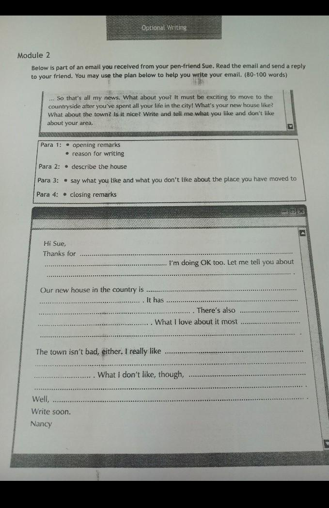 Ниже приведена часть электронного письма, которое вы получили от своей подруги по переписке Сью. Прочтите письмо и отправьте ответ. своему другу. Вы можете использовать приведенный ниже план для написания электронного письма. (80-100 слов)
