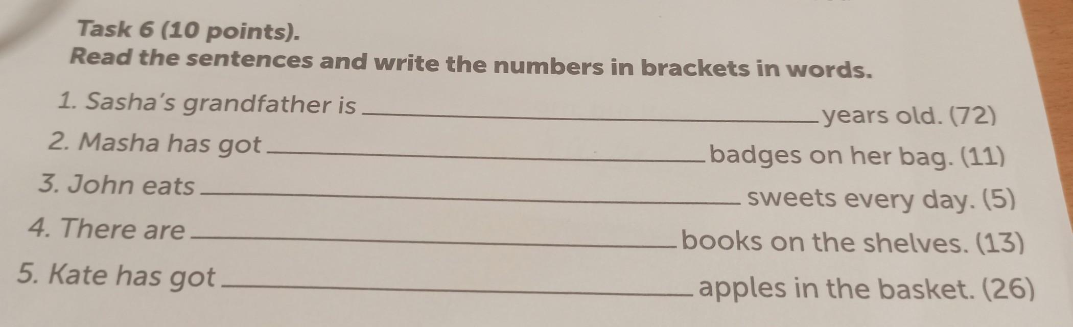 Task 6 (10 points). Read the sentences and write the numbers in brackets in words. years old. (72) 1. Sasha's grandfather is 2. Masha has got 3. John eats badges on her bag. (11) sweets every day. (5) books on the shelves. (13) apples in the basket. (26) 4. There are 5. Kate has got