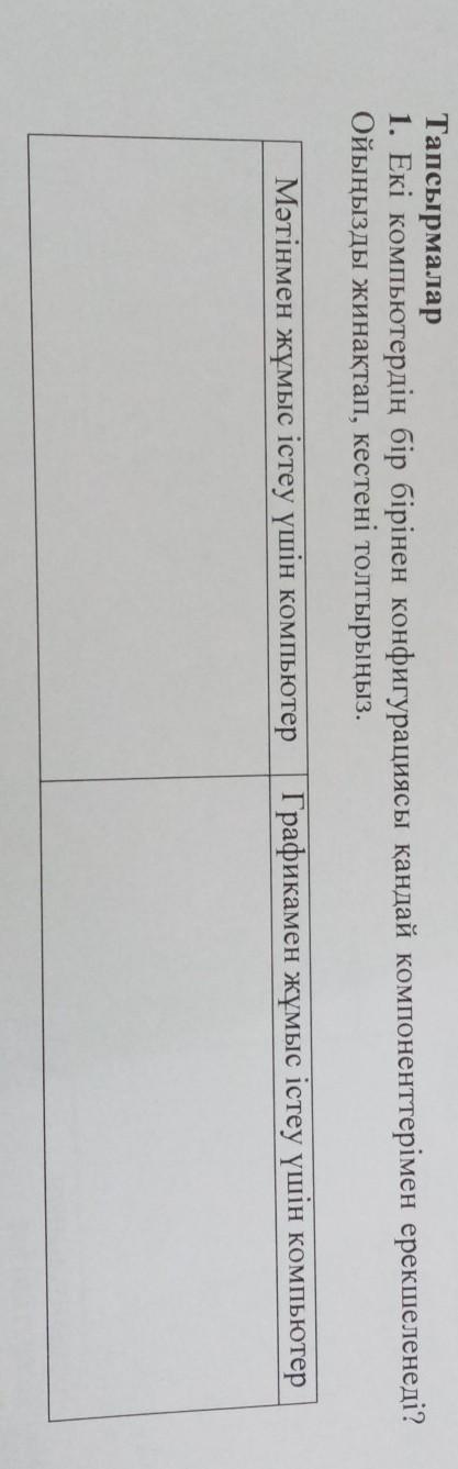 Тапсырмалар 1. Екі компьютердің бір бірінен конфигурациясы қандай компоненттерімен ерекшеленеді? Ойыңызды жинақтап, кестені толтырыңыз. Мәтінмен жұмыс істеу үшін компьютер: