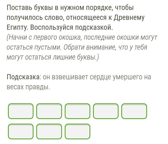 Поставь буквы в нужном порядке, чтобы получилось слово, относящееся к Древнему Египту. Воспользуйся подсказкой. (Начни с первого окошка, последние окошки могут остаться пустыми. Обрати внимание, что у тебя могут остаться лишние буквы.) Подсказка: он взвешивает сердце умершего на весах правды.