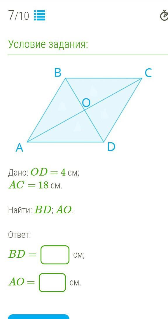 Дано: OD = 4 см; AC= 18 см. Найти: BD; AO.