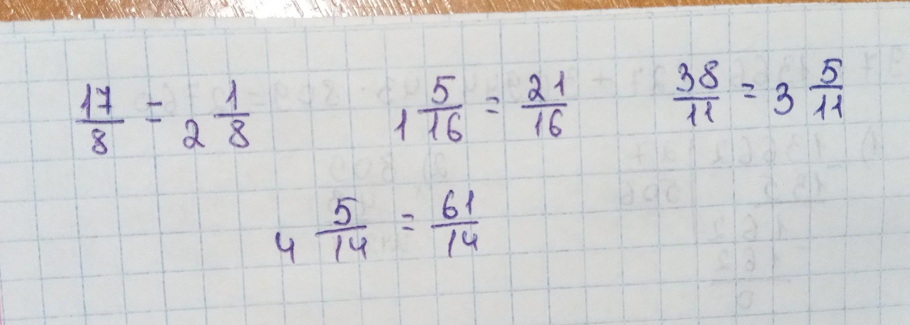 чтобы переобразовать неправильную дробь, в смешанное число, нужно посмотреть сколько раз занаменатель вместиться в числитель. на примере первого примера обьясню. в дроби 17/8, число 8 поместиться 2 раза в числе 17, так как 8*2=16. поэтому после равно пишем большую двойку. теперь мы от числителя отнимаем число, которое только что получилось, тоесть 17-16 и это = 1 (единицу пишем в числитель), а знаменатель так и остаётся. в итоге у нас получается 2 1/8