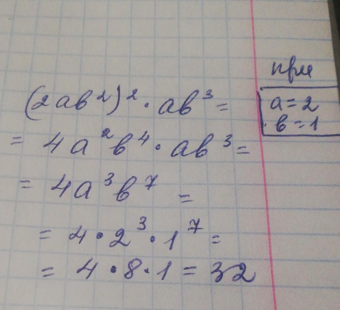 (2ab²)²*ab³=4а²b⁴*ab³=4a³b⁷| =4*8*1=32
