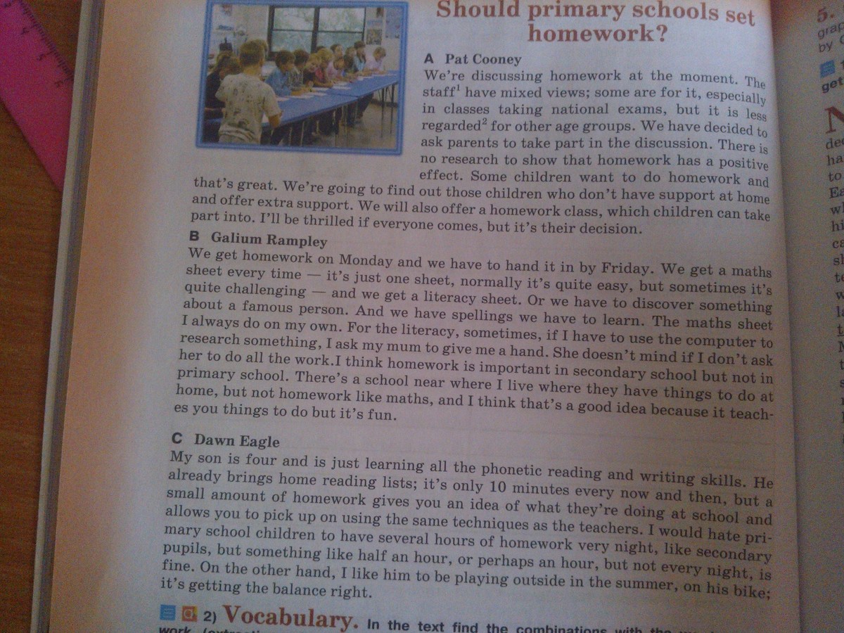 Мы обсуждаем домашнее задание на данный момент. Коллектив имеет разные мнения; некоторые из них, например классы,в которых проводятся международные экзамены, или менее рассматриваемые другие возрастные группы. Мы решили попросить родителей, чтобы принять участие в дискуссии. Нет исследований, которые показывают, что домашнее задание имеет положительный эффект. Некоторые дети хотят делать домашнее задание, и это здорово. Мы собираемся помочь тем детям, которые не имеют поддержки на дому и предложить дополнительную поддержку. Мы также будем предлагать выполнить домашнее задание в классе, где дети смогут принять участие. Я буду очень рад, если все придут, но это их решение.