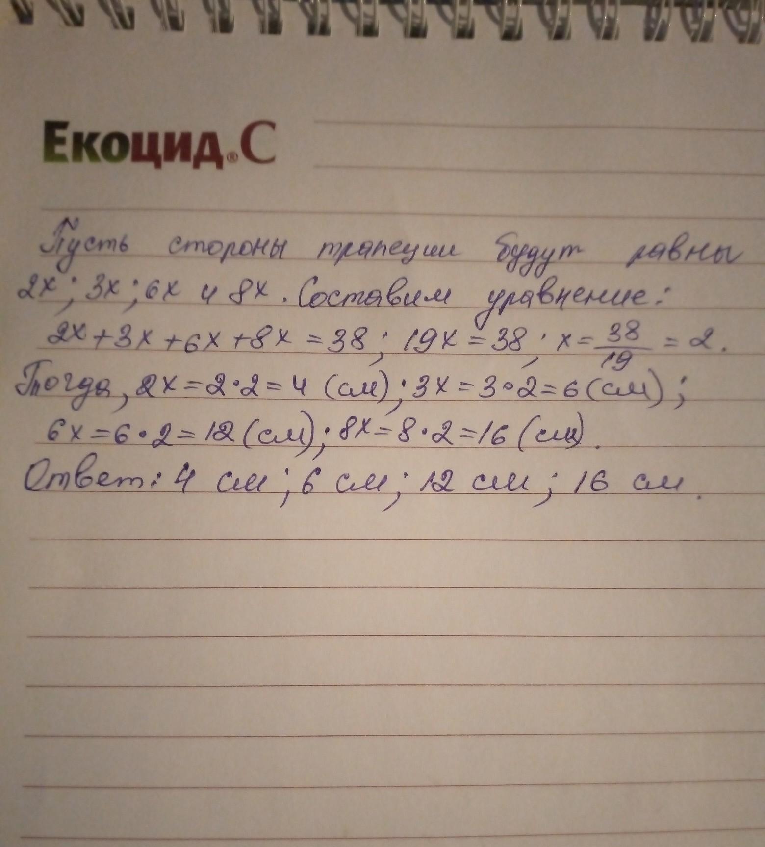 Стороны трапеции соотносятся как 2:3:6:8, а периметр её равен 38 см.