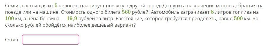 Семья, состоящая из 5 человек, планирует поездку в другой город. До пункта назначения можно добраться на поезде или на машине. Стоимость одного билета 560 рублей. Автомобиль затрачивает 8 литров топлива на 100 км, а цена бензина — 19,9 рублей за литр. Расстояние, которое требуется преодолеть, равно 500 км. Во сколько рублей обойдётся наиболее дешёвый вариант?