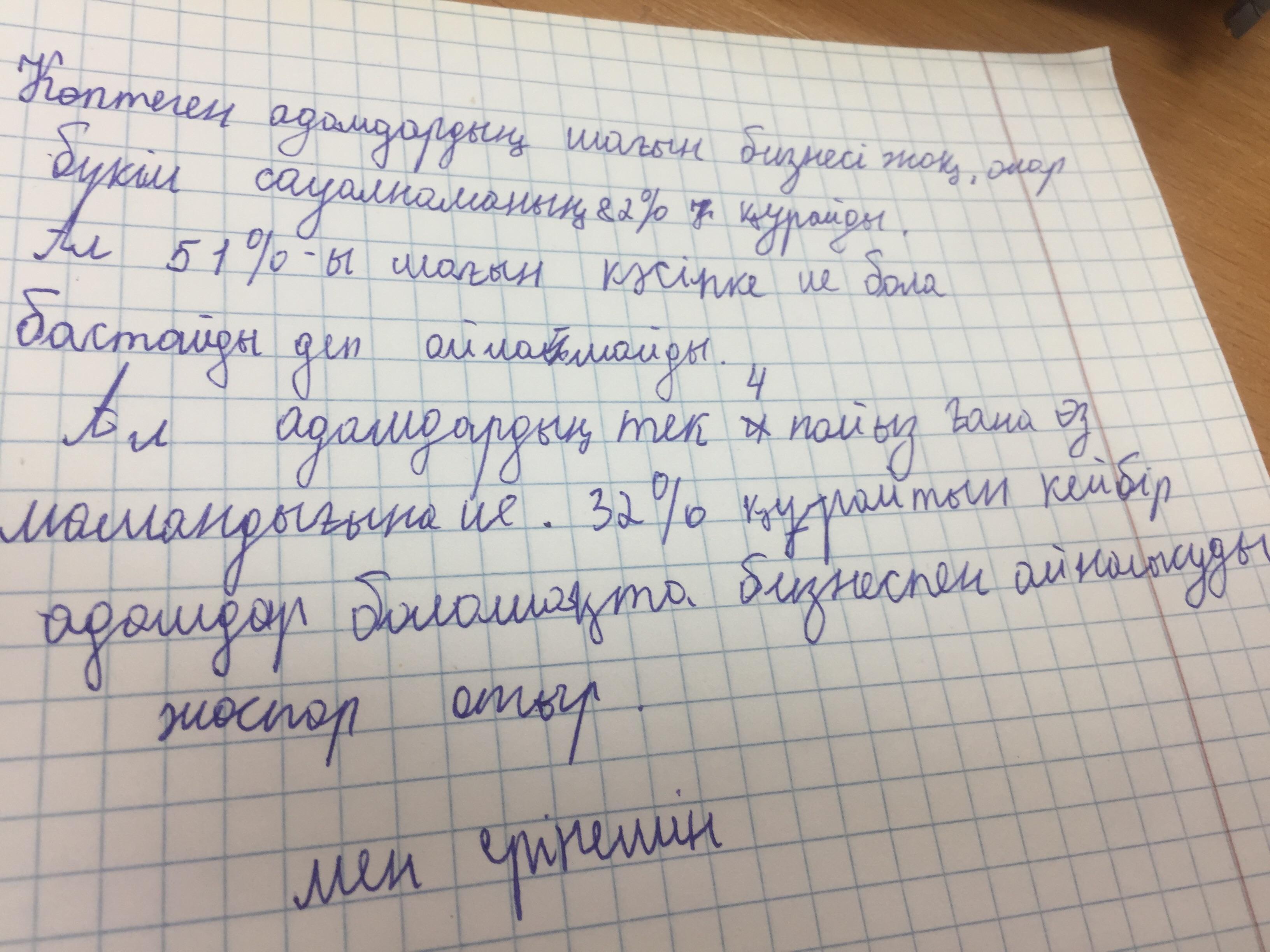 көптеген адамдардың шағын бизнесі жоқ, олар бүкіл сауалнаманың 82% құрайды. ал 51%-ы шағын кәсіпке ие бола бастайды деп ойламайды. ал адамдардың тек 4% ғана өз ........... ие. 32% құрайтын кейбір адамдар болашақта бизнесіне ойнасысуды жоспар отыр