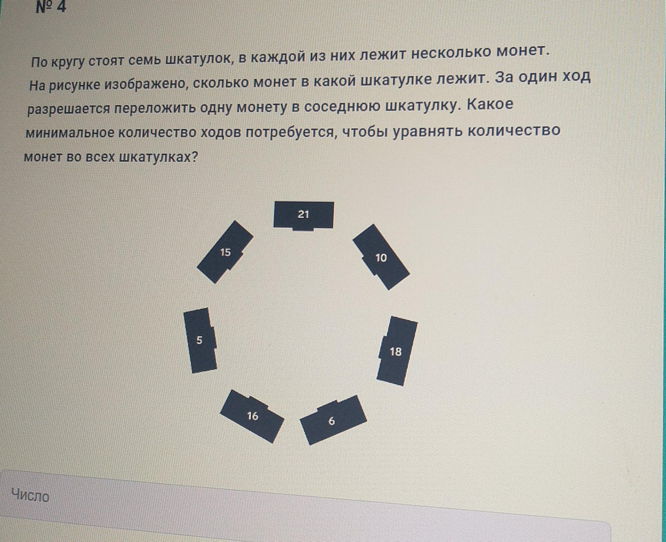 По кругу стоят семь шкатулок, в каждой из них лежит несколько монет. На рисунке изображено, сколько монет в какой шкатулке лежит. За один ход разрешается переложить одну монету в соседнюю шкатулку. Какое минимальное количество ходов потребуется, чтобы уравнять количество монет во всех шкатулках?