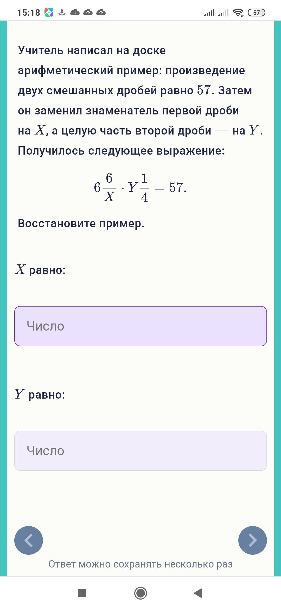 Учитель написал на доске арифметический пример: произведение двух смешанных дробей равно 57. Затем он заменил знаменатель первой дроби на X, а целую часть второй дроби — на Y. Получилось следующее выражение: