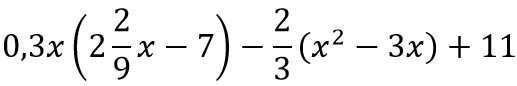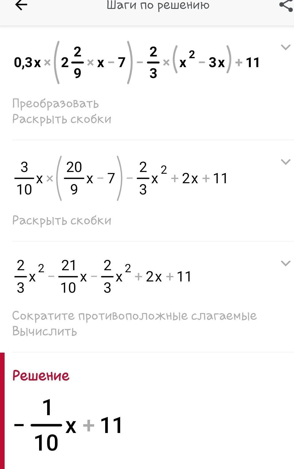 0,3х(2 2/9х-7)-2/3(х^2-3х)+11=-1/10х+11(решение на фото)