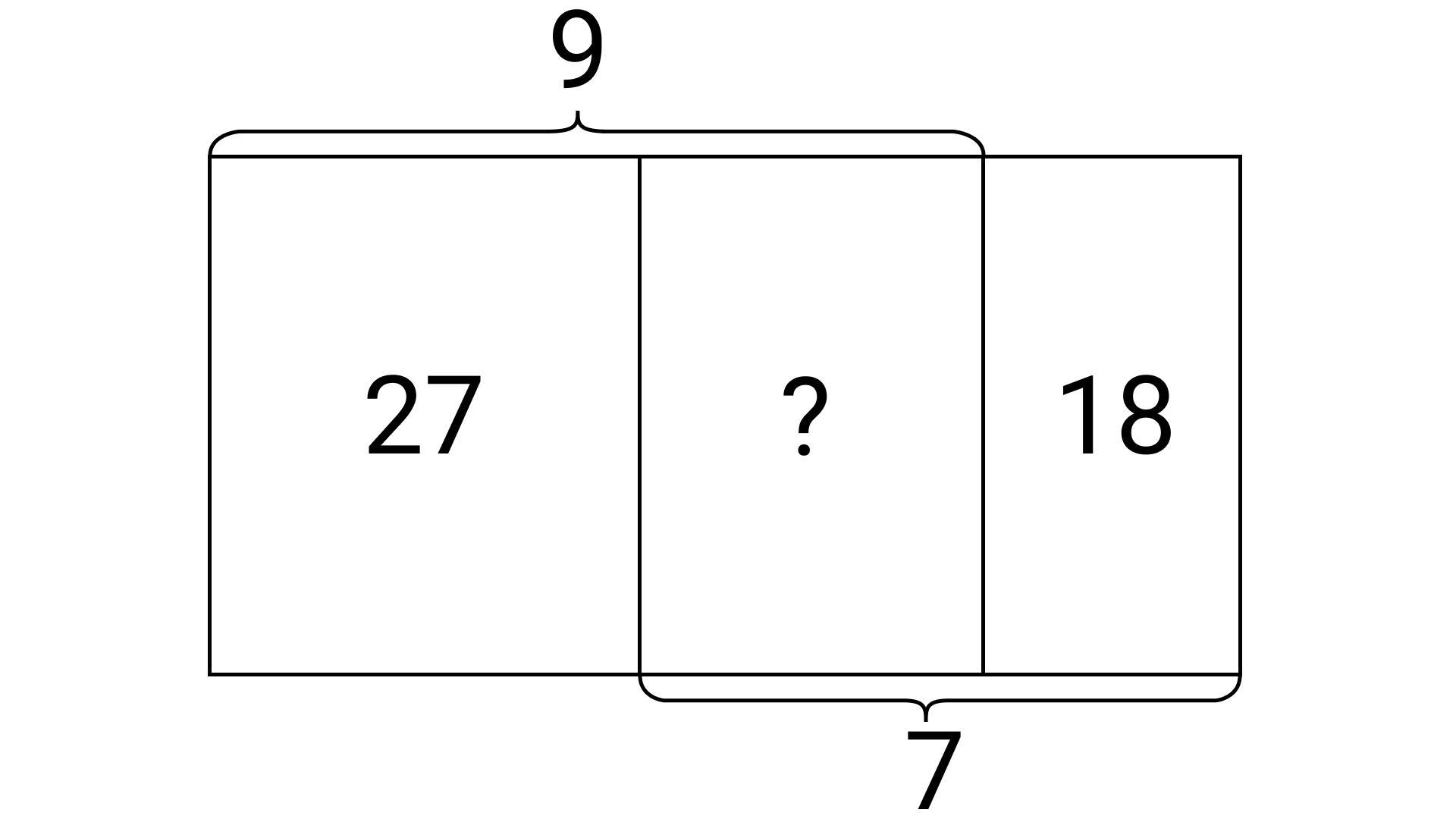 Прямоугольную полоску длины 16 разрезали на две полоски длин 9 и 7. Эти две полоски положили на стол так, как показано на рисунке. Известно, что площадь части стола, покрытой только левой полоской, равна 27, а площадь части стола, покрытой только правой полоской, равна 18. Найдите площадь части стола, покрытой обеими полосками.