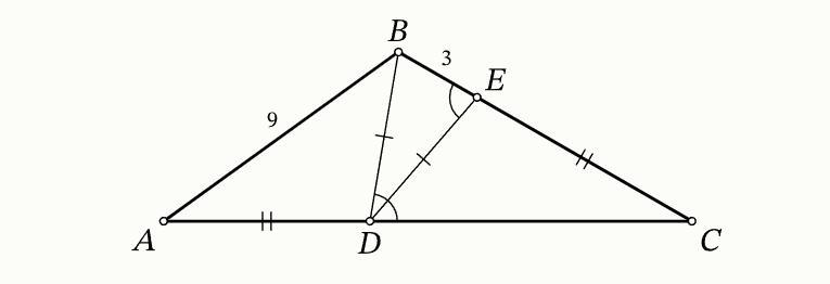 Точки D и E отмечены соответственно на сторонах AC и BC треугольника ABC так, что AD=EC. Оказалось, что BD=ED, ∠BDC=∠DEB. Найдите длину отрезка AC, если известно, что AB=9 и BE=3 .
